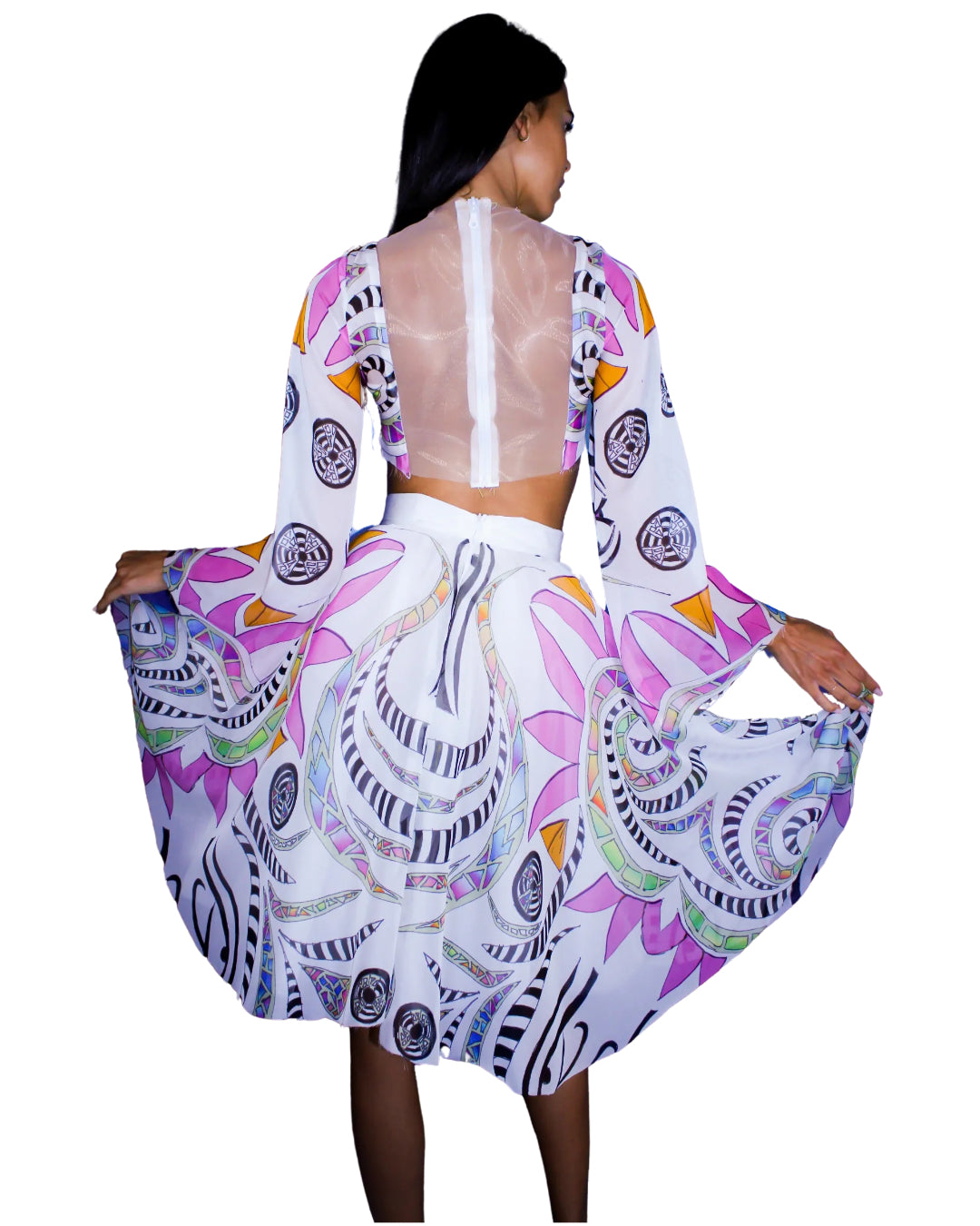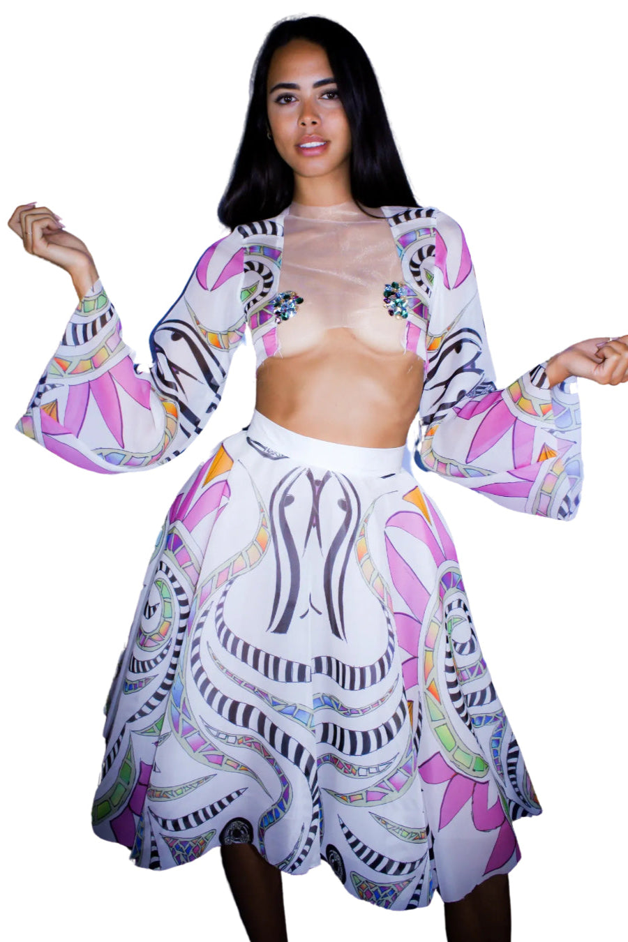 Funky Bell sleeve Crop Top features hand drawn Egyptian mosaic digital print on 100% Silk Chiffon embellished crystals from Swarovski on mesh. The perfect statement piece, rock with matching skirt https://dumebifashion.com/fr-fr/products/phoenix-chiffon-tulle-skirt for full look or combine with a simple skirt, pair of jeans for a more casual elegant night out