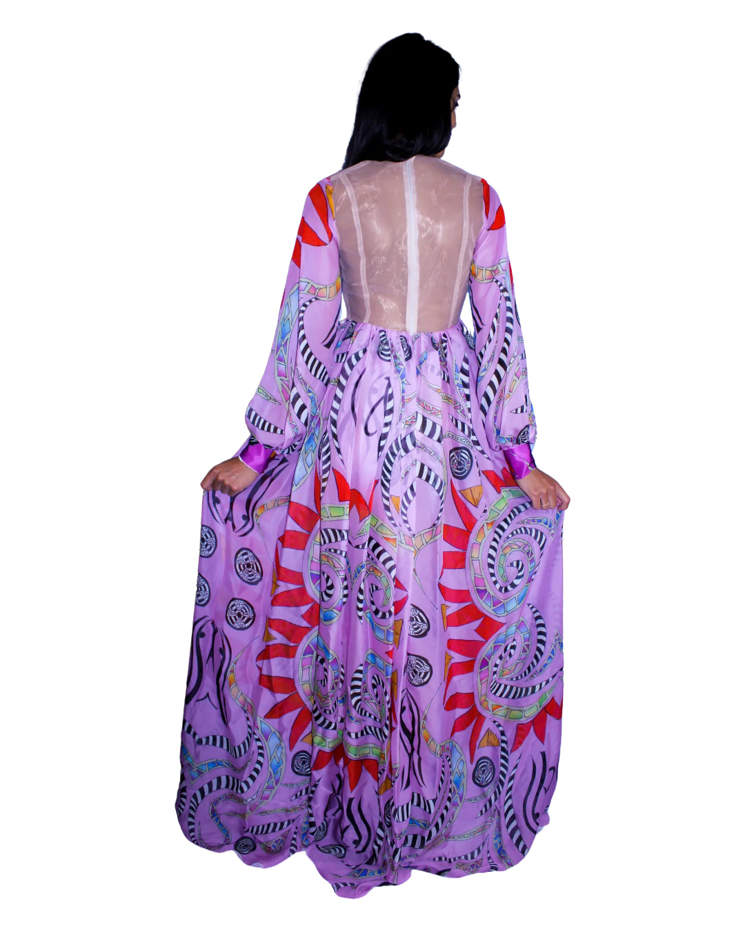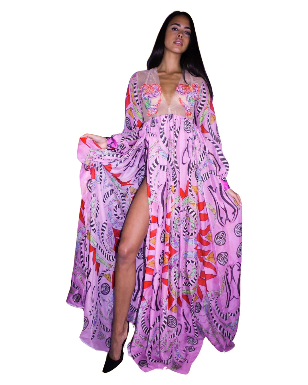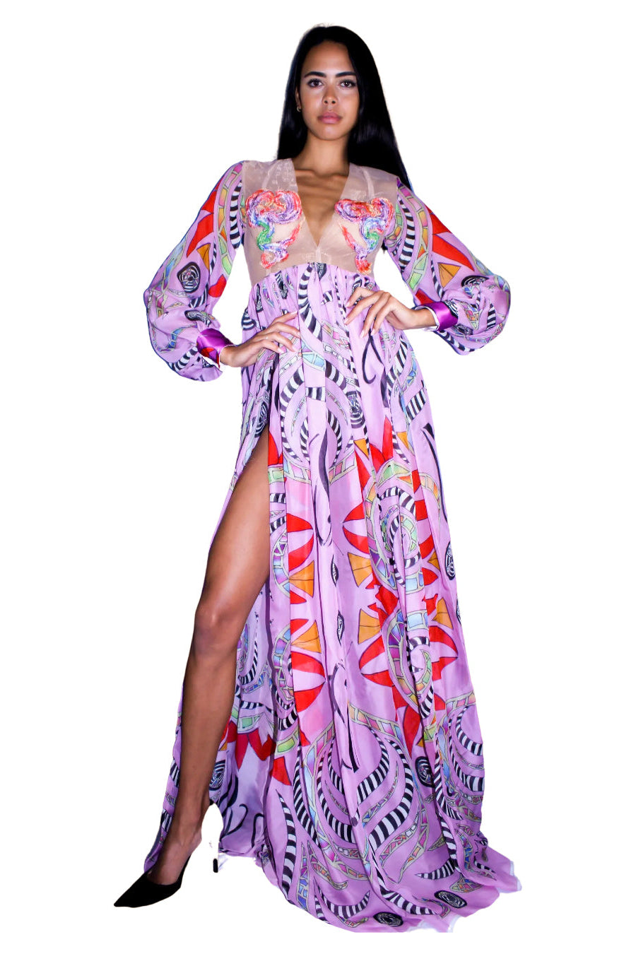 It's all about the slit with our Ethereal Bishop sleeve high slit Gown made with hand drawn Egyptian mosaic digital print on 100% Silk Chiffon combined with intricate Freehand embroidery motif on mesh