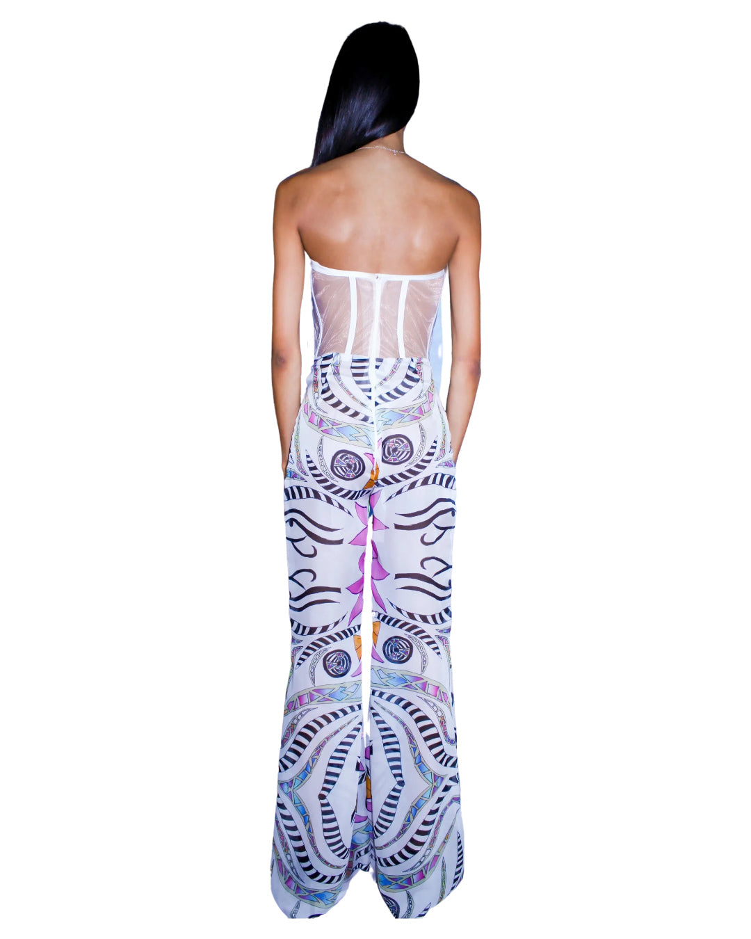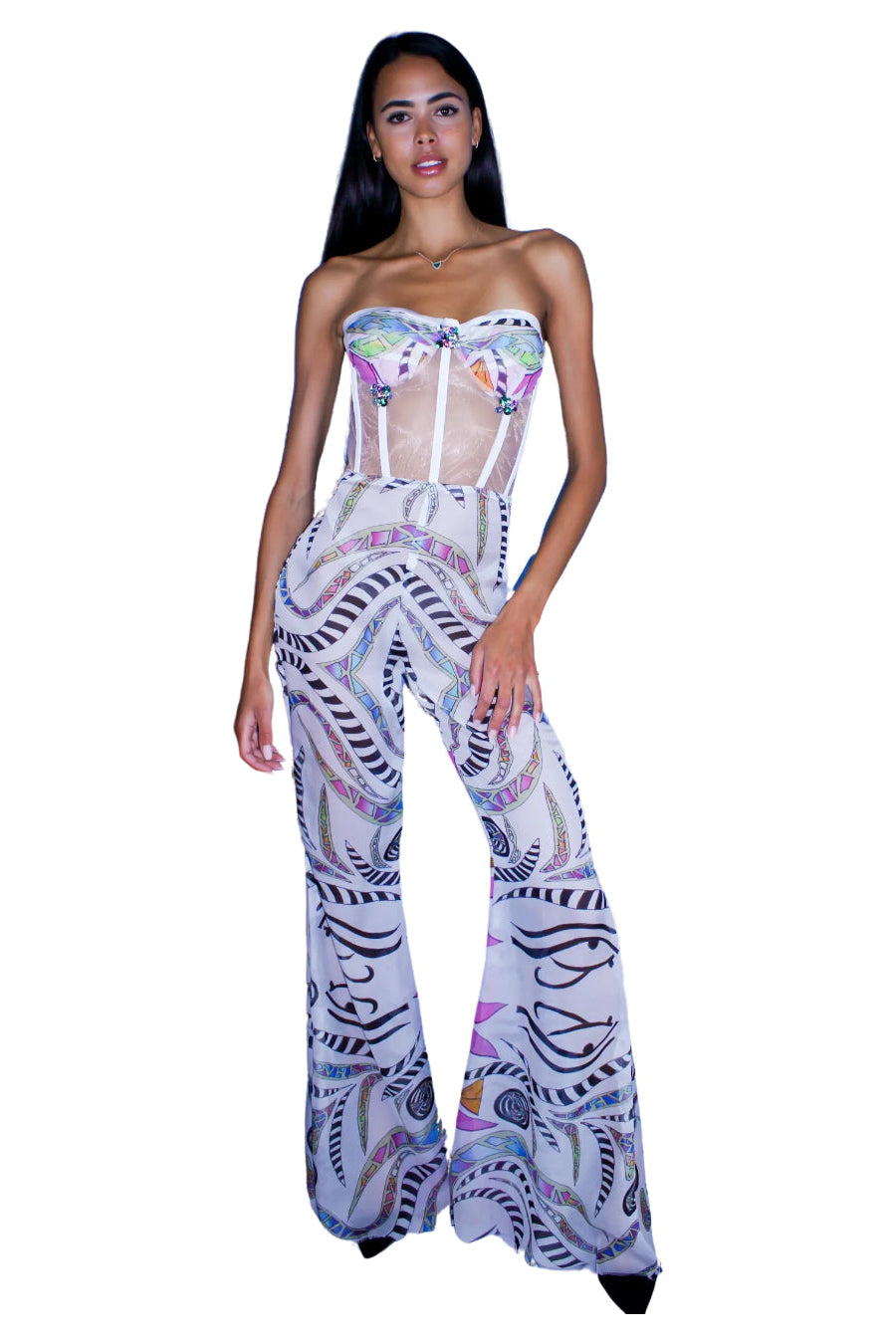 Straight off the Runway at Paris Fashion Week this groovey jumpsuit features flare trousers and a corset bodice made with hand drawn Egyptian mosaic digital print on 100% Silk Chiffon embellished with Crystals from Swarovski on mesh